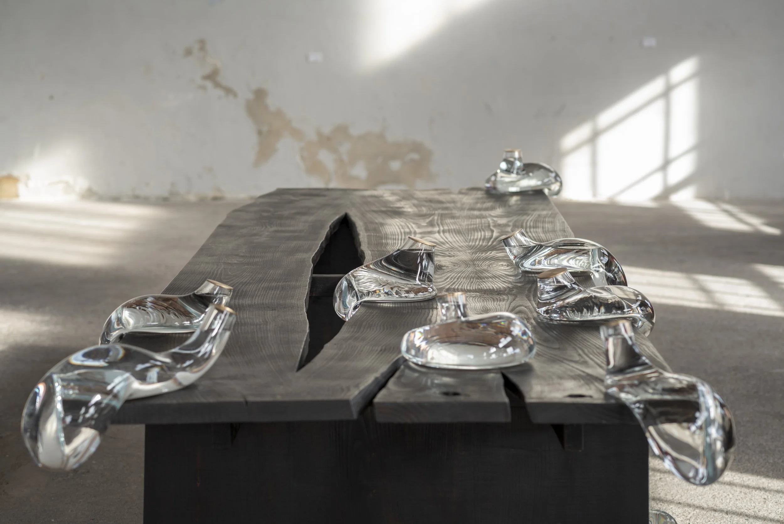 GOTAS ARE A HAND-BLOWN GLASS LAMPS AND EACH PIECE IS UNIQUE. They resemble water drops that adapt to different room situations like a corner, edge or a base. When its interior is filled with water the piece comes alive reflecting its magical light and bringing a natural element to the surrounding space.